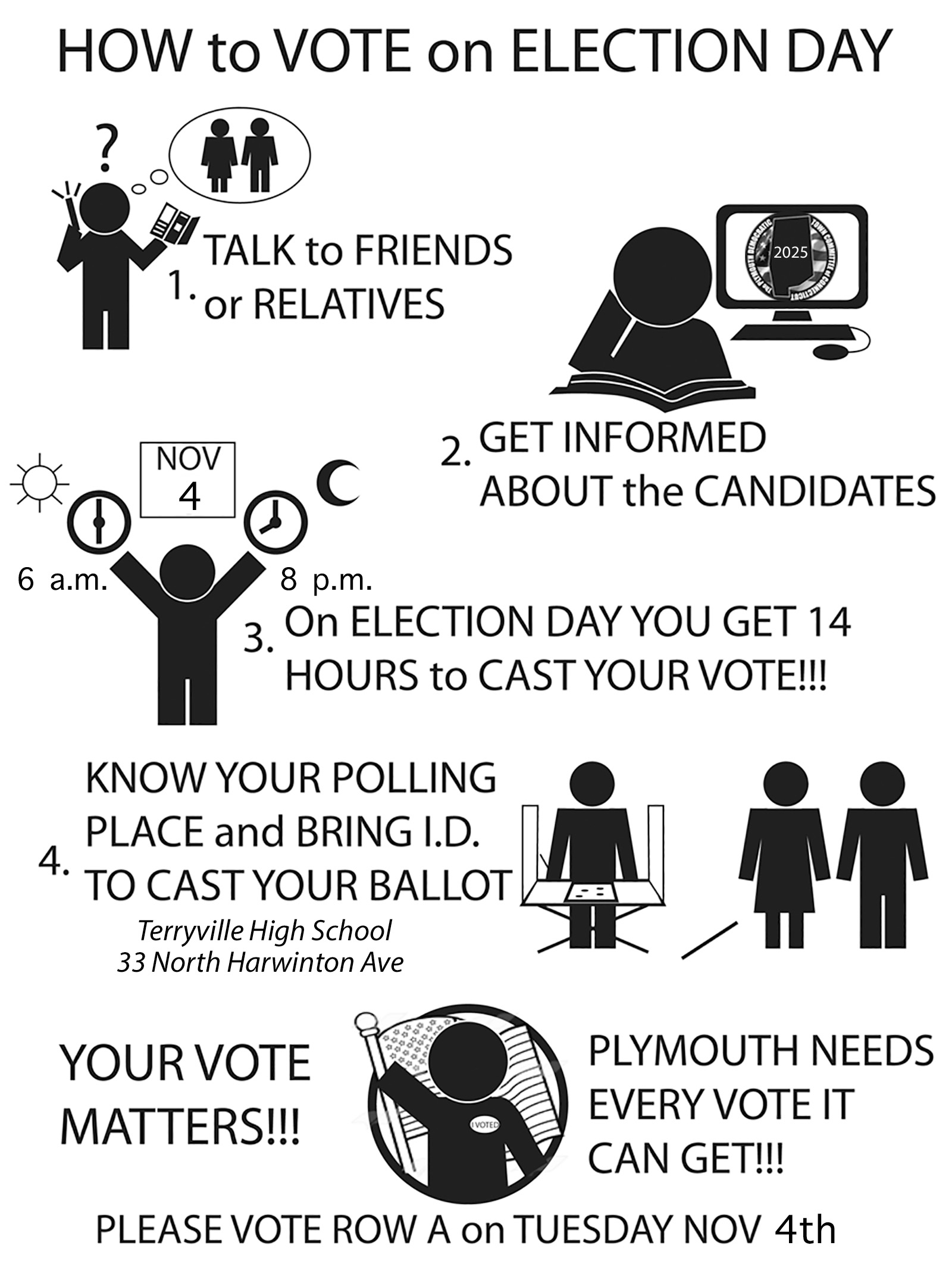 If you have not already voted during the early days, ELECTION DAY NOV 4TH is at TERRYVILLE HIGH and NOT at TOWN HALL.
